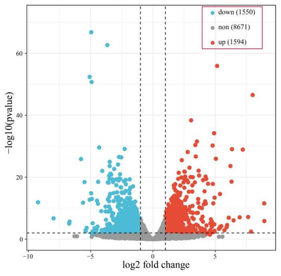 Data filtering and quality control were carried out with fastp (Version: 0.23.4) software, and the resulting clean data were used for subsequent analysis [23]. StringTie was used for read assembly quantification. The fragments per kilobase of exon per million fragments mapped (FPKM) value refers to the number of reads per thousand bases of exons per million maps, and the amount of gene expression was calculated using the FPKM method [24,25]. DESeq2 was used to calculate the fold change in expression of genes between different samples according to the expression level of the genes [26]. A p-value < 0.05 and a median|log2-fold change| ≥ 1 were used as the standards for screening differentially expressed genes. GO and KEGG enrichment analyses were performed on all DEGs [27].