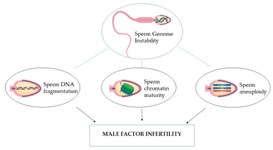 Genome instability in sperm can be accessed via SDF, chromatin maturity and aneuploidy which might potentially lead to a male factor infertility as schematically presented in Figure 1.