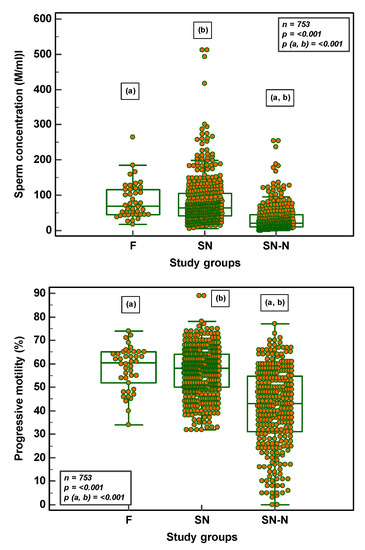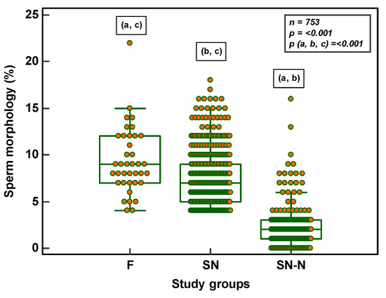 In the semen samples analysed (F = 42; SN = 416; SN-N = 295), there was a significant difference (p < 0.001) between the three study groups as far as sperm concentration, motility and morphology was concerned. With the significance being more pronounced between the F and SN-N and between SN and SN-N groups for sperm concentration and progressive motility. Sperm morphology in the SN group, although within the normal threshold values, was significantly lower than the F group (Figure 2).