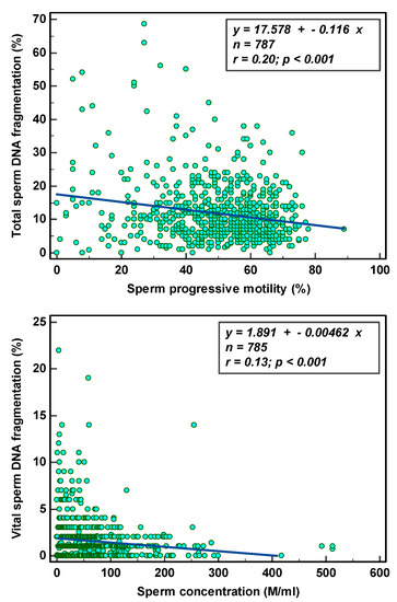 Total SDF was significantly negatively correlated (r = −0.14; p ≤ 0.001) with progressive motility and vital SDF (r = −0.08; p ≤ 0.001) with sperm concentration (Figure 3).