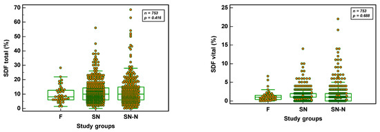 Total SDF did not differ significantly (p = 0.416) whether the semen samples were from an F (8.1 ± 5.8; n = 42), SN (11.7 ± 7.8; n = 416) or SN-N (12.2 ± 10.2; n = 295) study group. The same was also the case (p = 0.688) in the vital SDF fractions (F = 1.3 ± 1.4; SN = 1.4 ± 1.6 and SN-N = 2.0 ± 3.0, respectively). Figure 4 reveals the distribution of SDF parameters in the three study groups.