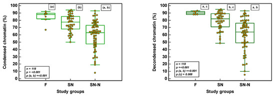 The significance was more pronounced between the F and SN-N and between SN and SN-N groups for all four chromatin parameters (Figure 5). Chromatin decondensation was significantly reduced and hypercondensation significantly increased in the SN group as compared to the F group (Figure 5).