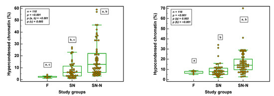 Incorrect chromatin compaction/hypocondensation exposes spermatozoa to DNA damage [54]. However, abnormal sperm chromatin packaging can also be manifested as a supernormal compaction which would prevent the delivery of the male genome in the oocyte [55]. Any abnormalities in the unique organization of sperm chromatin are thought to affect the proper expression and regulation of paternal genes in the early embryo [56]. In the F group, the hypo and hypercondensed ranges were low, while in the SN and SN-N groups, tremendous variations were observed.
