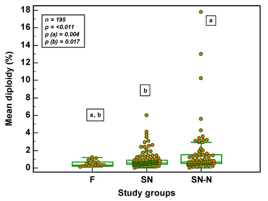 The frequency of diploidy, on the other hand, was significantly different in the three study groups (p = 0.011). With the significance being between F and SN and between F and SN-N groups (Figure 6).