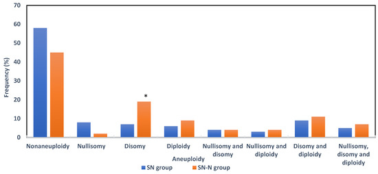 Frequency of aneuploidies after FISH analysis (SN = subfertile population with normozoospermia; SN-N = subfertile non-normozoospermic population). * Fischer’s exact test p = 0.0108.