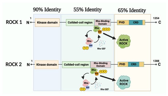 Molecular structure of ROCK 1 and ROCK 2. They are similar and both contain a kinase domain, coiled-coil region, rho-binding domain, putative pleckstrin homology domain (PHD) and cysteine-rich domain (CRD). Rho GEF = Rho guanine nucleotide exchange factor. Created with BioRender.com.