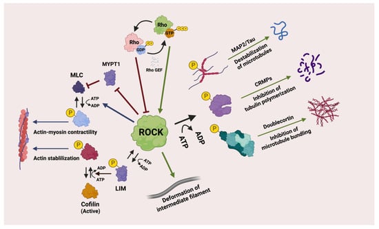 ROCK proteins regulate different types of intermediate filaments via phosphorylation. For example, ROCK proteins can breakdown and separate the intermediate filaments via phosphorylation. It also upregulates the cell stiffness by interacting with keratin intermediate filaments [,,,,]. Interestingly, activation of ROCK induces the deformation of intermediate filaments (Figure 2) with an instant release of inactive ROCK. The released ROCK is transported to the periphery of the cell and reactivated by Rho-GTP, it can then accelerate the phosphorylation and disassembly of intermediate filaments []. In addition, ROCK regulates microtubules by phosphorylation of several microtubule-associated proteins such as MAP2/Tau [], collapsin response mediator protein 2 (CRMP2) [] and Doublecortin [] (Figure 2). ROCK-induced phosphorylation of MAP2/Tau leads to destabilization of the microtubules [,]. CRMPs stabilize microtubules however this is inhibited by phosphorylation via ROCK []. Doublecortin is a microtubule-associated protein. Phosphorylation of Doublecortin via ROCK inhibits microtubule bundling []. In addition, ROCK regulates microtubule acetylation via phosphorylation of the tubulin polymerization promoting protein 1 (TPPP1/p25), resulting in a decreased cellular level of acetylated tubulin and increased cell migration [].