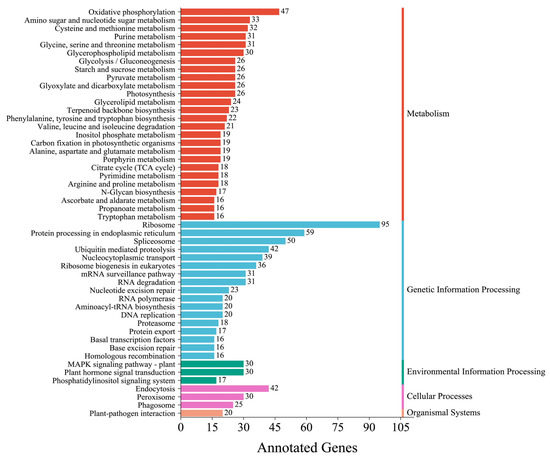 A total of 2020 unigenes were found in the KEGG database and assigned to 127 KEGG functional pathways belonging to five large groups (“metabolism”, “genetic information processing”, “environmental information processing”, “cellular processes”, and “organismal systems”). “Ribosome” (95), “protein processing in endoplasmic reticulum” (59), and “spliceosome” (50) were the main pathways among the top 50 pathways (Figure 4). In addition, 23 unigenes were found in the “terpenoid backbone biosynthesis” pathway.