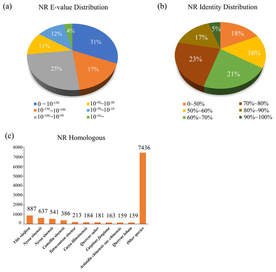 The E-value distribution revealed that 31.26% of the unigenes yielded significant hits in the NCBI NR nucleotide database (Figure 5a), and approximately 21.65% of these unigenes exhibited greater than 80% identity (Figure 5b). The sequence alignment results of the NR protein revealed that 887 unigenes could be aligned with Vitis vinifera, 637 unigenes could be aligned with Nyssa sinensis, and 541 could be aligned with Vitis riparia (Figure 5c).