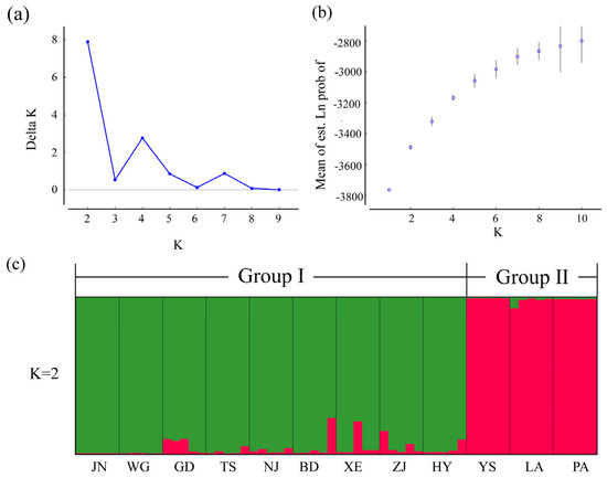 Structure analysis of 60 C. macrophyllum from 12 populations based on 10 EST-SSRs. (a) Distribution of ΔK in STRUCTURE analysis. (b) The likelihood L(K) values presented for K = 1–10. (c) Histogram of the STRUCTURE analysis for the model with K = 2 (showing the highest ΔK). Different colors represent genetic stock.