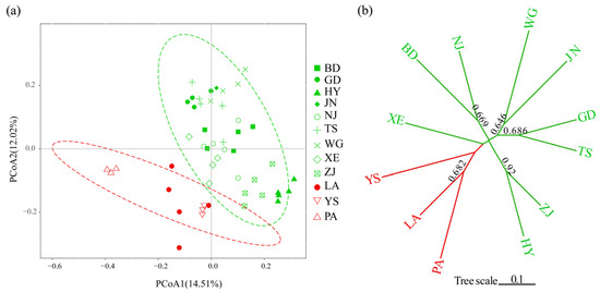 The population structure of C. macrophyllum was analyzed by using STRUCTURE 2.3.4, and the optimal K value was observed at K = 2, with the maximum ΔK value (Figure 6a,b). All collected individuals were divided into two genetic groups (Figure 4c). Group I contained eight populations (JN, WG, GD, TS, NJ, BD, XE, ZJ, and HY), whereas Group II included three populations (YS, LA, and PA) (Figure 6c). PCoA based on the 10 EST-SSR markers was used to evaluate the population genetic structure. Consistent with the results of structure analysis, the PCoA results also revealed two groups based on genetic distance (Figure 7a). The first and second axes explained 14.51% and 12.02% of the total variation, respectively. In addition, a neighbor-joining tree was constructed by using DA distances. In the tree, individuals were divided into two groups, in agreement with the two genetic groups identified by PCoA and STRUCTURE (Figure 7b).