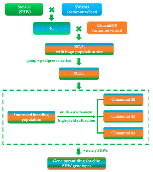 How to utilize primary SHW for wheat improvement effectively? Different geneticists and/or breeders summarized various advisable strategies from different perspectives [15,67]. Here, according to our application practices of SHW for decades, using the ‘large population with limited backcrossing method’ was suggested as an effective breeding strategy for direct breeding application of SHW to improve the breeding population and select elite cultivars. These improved SHW derivatives could be used as a basic genetic framework for the next round of pyramiding favorable genes from new SHW lines or other breeding lines. Additionally, for further QTL/gene pyramiding, the RIL-based breeding method could be beneficial by accurately evaluating their breeding value and identifying suitable new cultivars that should be selected.
