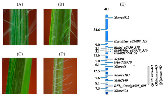 Unlike the common hexaploid wheat with glabrous leaf sheaths, most SHW accessions have a hairy leaf sheath, which is mostly present in wild species of Triticeae, such as Ae. tauschii and T. turgidum var. dicoccoides. Chuanmai 42 has a hairy leaf sheath that was derived from the SHW line Syn769 (Figure 3). Genetic analysis showed that the LSH is from Ae. tauschii with its controlling gene on chromosome 4DL [37]. Interestingly, almost all cultivars derived from Chuanmai 42 inherited the hairy leaf sheath character, even in the 2nd generation, which was caused by the tight linkage between the LSH gene and the QTLs associated with grain weight and yield in Syn769 (Figure 3E; [37]). In breeding programs, the leaf sheath hairiness can be used as a morphological marker for high grain yield QTL selection from Chuanmai 42 derivatives.