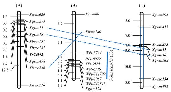 With a total of 1029 simple sequence repeat (SSR) and 2268 DArT markers detecting polymorphisms among three parents (Syn769, SW3243, and Chuan6415) of Chuanmai 42, the frequency of SHW alleles introgressed to Chuanmai 42 was 15.14%, which was significantly less than the expected 25% assuming random gene assortment. The distribution of introgressed alleles over the A, B, and D genomes was not uniform (B > A > D); introgression occurred most frequently on chromosomes 1A, 1B, 2B, 3A, 4D, 6A, and 6B, whereas none were detected on chromosomes 1D and 7A [13,48,49]. On chromosome 1B, the stripe rust resistance gene YrCH42 from Chuanmai 42 (Figure 4A; [50]) and the QTL allele for increased grain number per spike (Figure 4B; [51]) originated from its SHW parent Syn769 (Figure 4C; [48]).