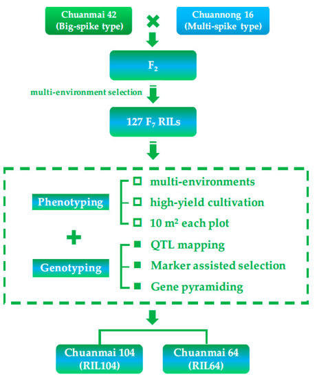 We genotyped each F7 RIL using SSR and DArT markers, and evaluated yield-related traits of each RIL (10 m2/plot) in multiple environments with high-yield cultivation. The F2 population of Chuanmai 42 × Chuannong 16 was exposed to different environmental stress to generate more gene recombination [54,55], and 127 RILs were finally obtained. Additionally, we combined phenotypic and genotypic evaluations to artificially select cultivars with high yield potential. Our team referred to this as the ‘RIL-based breeding method’ (Figure 5). Their obvious differences with the traditional phenotypic evaluation for QTL analysis are reflected in the following aspects: (1) replacing single-seed sowing with planting density of high-yield wheat production in China, considering the trade-off between yield components and interplant competition; (2) expanding the planting area of each plot from 2–3 rows to at least 10 m2, simulating field conditions of wheat production, with the aim to bridge the gaps between individual and population performances. In addition, evaluating the contributions of high-yielding QTLs to grain yield on the population level rather than in the individual plant or panicle level was also highly recommended by Xiong et al. [56] recently.