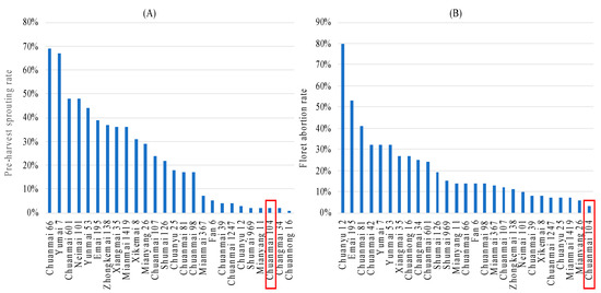 The yield potential of Chuanmai 104 was enhanced by its pre-harvest sprouting resistance and low-temperature tolerance at the flowering stage (Figure 6: unpublished data provided by Y.T.); it is more resistant than its parent, Chuanmai 42 (Figure 6B; [57]). Moreover, Chuanmai 104 had stripe rust and powdery mildew resistance, inheriting the resistance loci of YrCH42 [50], Qyr.saas-7B [58], and QPm.saas-4AS [59] from its parent Chuanmai 42 [51]. The actual grain yield over five continuous years’ field production ranged from 650 kg/mu to 700 kg/mu.
