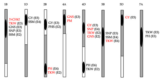 - Lu, B.; Deng, G.; Zhang, H.; Li, J.; Wan, H.; Pan, Z.; Yang, W.; Yu, M.; Long, H. QTL mapping of yield-related traits in the high-yield wheat variety Chuanmai42. Chin. J. Appl. Environ. Biol. 2017, 23, 0183–0192, (In Chinese with English abstract). [Google Scholar]
