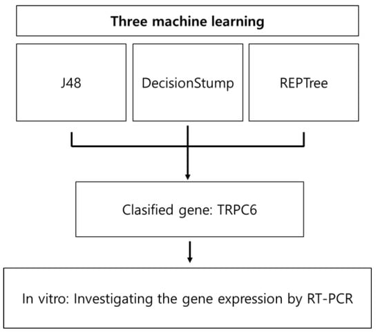 Typically, a decision tree algorithm applies pruning to deal with overfitting in the machine learning process. The algorithm produces an optimal decision tree through pruning, which soon shows which gene the algorithm is paying attention to []. According to the presented experimental results, all three algorithms produced classifiers by focusing on the 7225_at, which is termed TRPC6, and the accuracy of each classifier was also relatively high. This result shows that the algorithms generated the correct classifiers with only the TRPC6. Moreover, the experimental results suggest that TRPC6 plays a crucial role in terms of COPD classification using machine learning methods. This finding implies that TRPC6 is very important in terms of classification using machine learning and further suggests that TRPC6 can also be considered as a biomarker of COPD pathogenesis.
