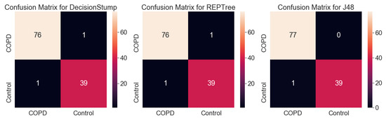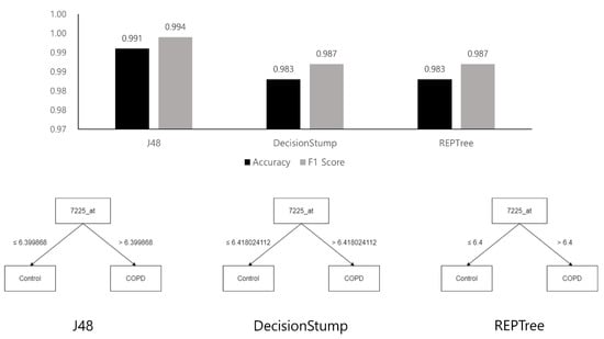 Figure 4 and Figure 5 show the tree structures obtained by learning the three decision tree models and their performances—J48, DecisionStump, and REPTree; all three models classified the data using only the value of gene ID 7225_at. These figures explain that algorithms that specially concentrated in 7225_at among genes in the microarray data while making decision trees classifying the disease. Moreover, these classifiers, using only 7225_at, showed significant performance in the COPD microarray profile dataset, with an accuracy of up to 0.991.