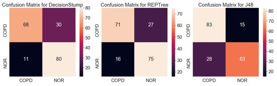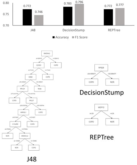 In this study, we generated decision tree models for classifying COPD gene expression data and investigated the genes that were crucial to classification by analyzing the generated decision tree structures. We used the J48, DecisionStump, and REPTree models [] implemented in WEKA []. Owing to the small amount of data, the results were verified using 10-fold cross validation []. We evaluated each classifier using the accuracy and F1 scores that were derived based on a confusion matrix [], as shown in Table 1.