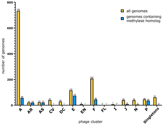 Bar graph depicting the total number of genomes per phage cluster in PhagesDB as of 27 December 2022 (yellow) and the number of genomes encoding a methylase in our dataset (blue). The clustering of phages in PhagesDB reflects overall nucleotide similarity, gene order, and gene content []. See the Methods Section for details.
