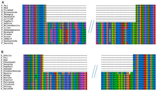 Sequence and metadata were retrieved from PhagesDB []. This database contains genomes from over 4000 actinobacteriophages. PhagesDB places phages into clusters and subclusters based on their genome content (specifically, gene content dissimilarity []). Protein-coding genes are placed into phams, also referred to as phamilies, based on sequence identity and BLASTP search results. These phams serve as the basis for the clustering process mentioned above and are useful to retrieve homologous sequences; however, the assignment of sequences to phams and the numbering of phams changes as PhagesDB expands. For annotated phages, i.e., no longer in draft status, the protein-coding genes are uniquely identified by the name of the phage, followed by the number of the open reading frame. This identification scheme is used throughout this manuscript and allows for the retrieval of the individual genes from PhagesDB. Genomes sequenced by the SEA–PHAGES program are also submitted to the NCBI. Individual genes can be retrieved using the phage-name_number of the gene as query at https://www.ncbi.nlm.nih.gov/gene/ (accessed 10 January 2023). For example, Dorothy_75 or PopTart_63 as query retrieves the genes linked to YP_009592050.1 and YP_009214423.1, respectively. Each gene in PhagesDB is linked to its pham, and all homologs assigned to the pham can be readily downloaded; however, as the pham numbers change over time, the phage name and ORF number provide a stable way to find the gene and associated pham in PhagesDB.