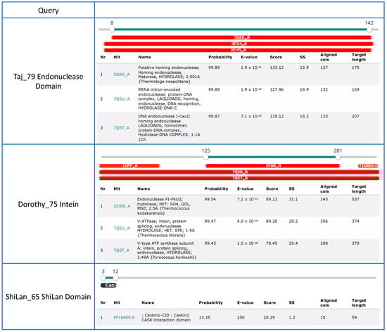 The initial discovery of the insertion containing methylase sequences in phages Dorothy and Cactusjack occurred during visual inspection of viral genomes via Phamerator []. This initial finding was followed by repeated searches for inteins in the PhagesDB database using BLAST and psi-BLAST []. Intein harboring methylases from these searches belonged to phams 106461, and 105558 (as of 18 May 2022). The sequences for these phams are available in the Supplementary Materials (Supplementary Material files Pham_105558(05_18_2022).txt and Pham_106461(05_18_2022).txt). These phams were used as our source of sequence data going forward. All sequences used in this research were downloaded from PhagesDB on 18 May 2022; metadata on the phages were updated on 31 August 2022. In-house scripts used to construct local databases and extract metadata can be found at https://github.com/sophiagosselin/Methylase_Insertions (accessed 10 January 2023). HHPred [] was used to ascertain the potential identities of the various insertion elements. Analyses were performed using the default settings of the webserver at https://toolkit.tuebingen.mpg.de (accessed on 8 December 2022). Searched databases were PDB_mmCIF70_12_Aug, Pfam-A_v35, NCBI_conserved_Domains(CD)_v3.19, and TIGRFAMs_v15.0.