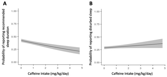 Predicted probability of reporting (A) recommended sleep duration (>9 h) and (B) disturbed sleep by caffeine intake (mg/kg/day) adjusted for psychotropic use (i.e., SSRIs, antipsychotics, and stimulants), gender, and population stratification (principal components 1–10). Shading represents 95% confidence intervals.