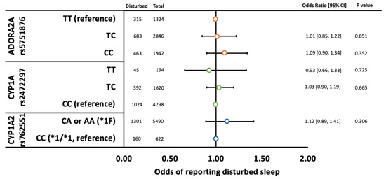 Odds of children reporting disturbed sleep by ADORA2A rs5751876 (orange circles), CYP1A rs2472297 (green circles), and CYP1A2 rs762551 (blue circles) genotypes adjusted for psychotropic use (i.e., SSRIs, antipsychotics, and stimulants), gender, caffeine use (mg/kg/day), and population stratification (principal components 1–10). Error bars represent 95% confidence intervals.