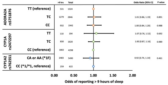 Odds of children reporting > 9 h of sleep by ADORA2A rs5751876 (orange circles), CYP1A rs2472297 (green circles), and CYP1A2 rs762551 (blue circles) genotypes adjusted for psychotropic use (i.e., SSRIs, antipsychotics, and stimulants), gender, caffeine use (mg/kg/day), and population stratification (principal components 1–10). Error bars represent 95% confidence intervals.
