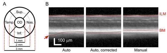 Measurement of the retinal thickness from OCT. (A) A scheme of divisions of the scanned retinal area exemplified on the right eye. The inner-most circle, optic disc (OD), contains the head of the optic nerve and was excluded from quantifications. The surrounding area was subdivided into four quadrants: superior (Sup.), inferior (Inf.), nasal (Nas.), and temporal (Temp.), respectively. The quadrants were further split into outer and inner parts (inner and outer ring, dashed line) which were quantified separately. In this text, we report the retinal thickness in each quadrant as an average of the outer and inner segment; (B) Three approaches to the retinal thickness measurement. The OCT recording software offered a fully automated detection of the retinal boundaries, i.e., the inner limiting membrane (ILM) and the Bruch’s membrane (BM), respectively (Auto, left image). Since substantial errors appeared in the automatic results (arrow), we corrected the obviously outlying points (Auto, corrected, middle image). The most precise and time-consuming approach, however, required a manual setting of the BM to its correct position above choriocapillaris (Manual, right image).