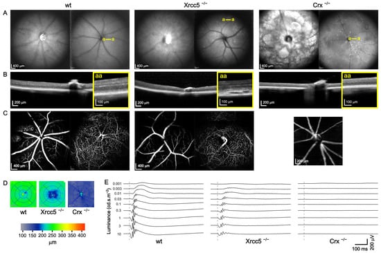 Example of OCT and ERG in a wt control mouse and Xrcc5 and Crx homozygote knockouts. (A) Representative SD-OCT infrared fundus images (left) and blue autofluorescence (BAF, right) images for each mouse strain. Large spotty lesions and an atypical pattern of superficial blood vessels were visible in Xrcc5−/−. Severe retinal degeneration in the Crx−/− mouse was accompanied by a typical pattern of large white patches in the fundus and many small white and dark dots in the BAF; (B) Cross-sectional images of the retina through the head of the optic nerve with zoomed-in views (yellow framed squares) of selected (yellow a–a lines in BAF) retinal parts. Peripheral retinal detachments were observed in Xrcc5−/− mice, see the magnified view; (C) Superficial (svp) and deep (dvp) vascular plexuses. Svp (left image) of the Xrcc5−/− mouse displayed an atypical pattern with crossings and branching of blood vessels, whereas the dvp (right image) was similar to the wt. On the other hand, in the Crx−/− animals, the retina was too thin to distinguish the border between the svp and dvp. Instead, we present one merged image of the whole retina depth that appears to contain no dvp; (D) Automatic retinal thickness quantification. A severe decrease in the retinal thickness was observed in the Crx−/− animal; (E) Typical scotopic ERG responses of the three mouse lines plotted to scale. Dashed lines denote the moment of light flash. The Xrcc5−/− mouse had smaller responses than the wt. The Crx−/− animal completely lacked any ERG response.