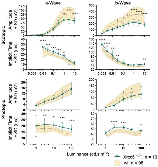 Scotopic and photopic ERG of Xrcc5−/− mice. Amplitudes and implicit times of dark-adapted waves a and b and light-adapted waves a and b of the Xrcc5 homozygote knockouts compared to the set of control wild-type (wt) data. Amplitudes and implicit times share the same x-axis, the luminance of stimuli. In general, the amplitudes of the Xrcc5−/− were significantly smaller compared to the controls (2-way ANOVA with Šídák multiple comparisons) for the highest stimulation intensities, except for the photopic wave a. Decrease of amplitude was also accompanied with prolonged implicit times of the respective waves. The p value is marked by asterisks, * p < 0.05, ** p < 0.01, *** p < 0.001, **** p < 0.0001, n represents the total number of eyes included in the analysis.