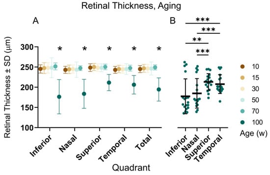 Retinal thickness during aging quantified by automatic retinal segmentation. (A) Retinal thickness did not change between 10- and 70-week-old mice in any quadrant of the retina. The only significant decline (2-way ANOVA with Tukey’s multiple comparisons, p < 0.0001) was observed in the oldest, 100-week-old individuals; (B) Further analysis of the elderly animals revealed that the most affected areas of the retina were the inferior and nasal quadrants (2-way ANOVA with Tukey’s multiple comparisons, * p < 0.05, ** p < 0.01, *** p < 0.001. The y-axis is shared with (A).