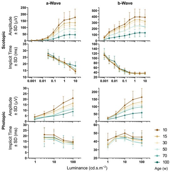 Full-field single-flash ERG during aging. Scotopic (upper part) and photopic (lower part) a and b waves, respectively. Related plots share the same x-axes (luminance of the stimuli). Decrease in response amplitude was observed between each two consecutive age groups except for the groups of 50 and 70 weeks. This finding was consistent for both scotopic and photopic responses. Age-related changes in implicit times were not obvious and the analysis returned a significant outcome only sporadically. The implicit times of the responses to the lowest luminance values were omitted from the analysis because the batch algorithm used was unable to correctly detect it when response amplitude was close to the background noise.