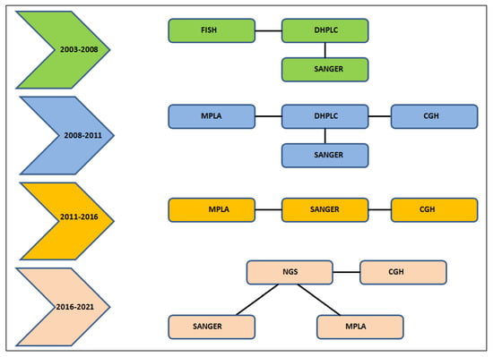 Considering the long time period in which this activity was performed, we would like to specify the evolution of the diagnostic workflow over the last 18 years (Figure 1). Across the years, fluorescent in situ hybridization (FISH) was replaced by array-comparative genomic hybridization (a-CGH), denaturing high-performance liquid chromatography (DHPLC) by Sanger analysis. Since 2017 to date, next generation sequencing (NGS) is the first-tier test for variant identification in Sotos patients. Sanger sequencing and multiplex ligation-dependent probe amplification (MLPA) analysis are still used to confirm pathogenetic variants identified by the NGS approach.