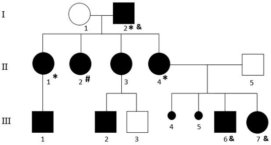 Pedigree of the family. “*” and “#” indicate the individuals carriers of arr[GRCH37]1q25.2(178443054_178964320)x3 and arr[GRCH37]Xp22.33(1217017_1378646)x3, respectively. “&” indicates the subjects in which the WES was performed.
