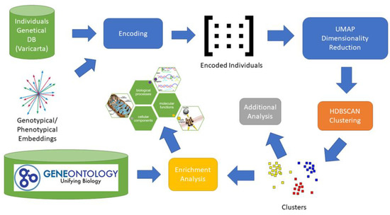 Analysis Process. The image depicts the entire process adopted to identify potential subgroups of individuals with ASD. For each individual included in the VariCarta database, the set of variated genes is selected and then encoded using the genotypical/phenotypical embedding space. Each individual is then represented with a 64-component vector in the genotypical/phenotypical embedding space. Dimensionality reduction is applied to the encoded individuals’ matrix to reduce clustering complexity. The genes of the resulting clusters are then used for the enrichment and endophenotype analysis.