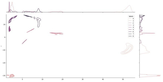 Joint Plot and density distribution of the clusters. Like an elevation map, the joint plot shows the local density of each cluster. The two plots on the two axes show the decomposition of the density into the two dimensions used for visualization. The dimensionality reduction from 64 to 2 dimensions was obtained using the UMAP algorithm.