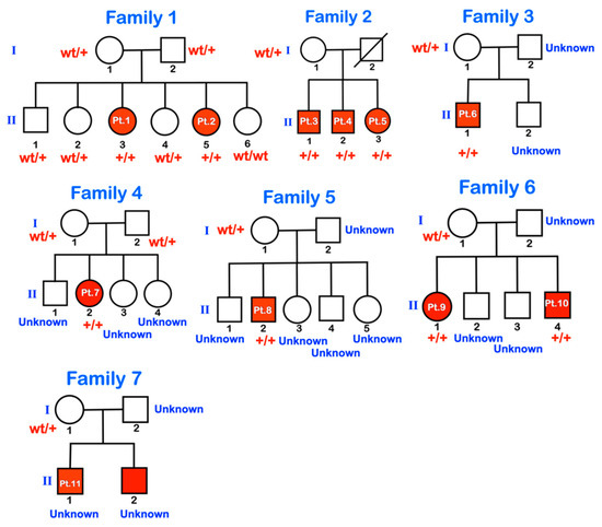 Pedigrees of families 1–7. wt = wild type; +/+ = homozygous for the variant; wt/+ = heterozygous for the variant. Unknown means genetic testing was not performed.