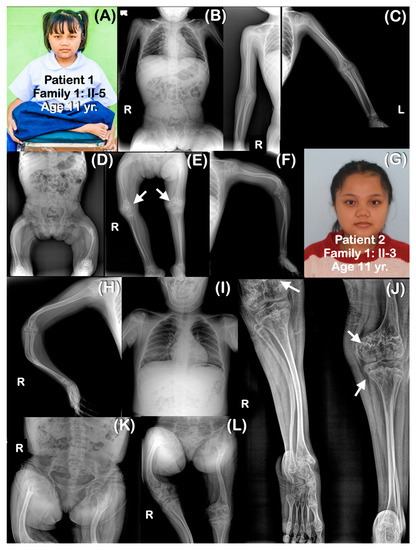 Family 1. (A–F) Patient 1 (Family 1: II-3). Age 11 years. Generalized osteopenia is noted. Ribbon rib deformity is observed. (E) Popcorn calcifications are observed at distal femoral metaphyses (arrows). Femora are shortened and curved. Fracture of left femur is healed. Humeri, radii, ulnae, tibiae, and fibulae are not bowed. (G–L) Patient 2 (Family 1: II-5). (G) Sister of patient 1. Age 17 years. Radiographs taken at 10 years. Generalized osteopenia is noted. Curved and slender long bones. The right femur is shorter than the left one. (L) Popcorn calcifications are observed at distal femora (arrows).