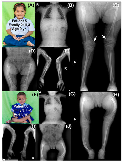 Family 2. (A–E) Patient 3 (Family 2: II-1). Age 13 years. Elder brother of patients 4 and 5. Generalized severe osteopenia. Severely dysplastic pelvis. The ribs are gracile (thin and slender). All long bones are severely slender and curved. Femora and humeri are shortened. (D,E) Popcorn epiphyses and metaphyses are observed at distal femora and proximal tibiae (arrows). Fractured humeri and right femur are healed. Left femur is severely shortened, and there is a fracture within proper healing in the middle part. (F–J) Patient 4 (Family 2: II-2). Age 10 years. Brother of patients 3 and 5. Generalized osteopenia. Severely dysplastic pelvis. All long bones are slender. Humeri and femora are shortened and curved. Fracture of left humerus is noted. (H) Large metaphyseal flare of distal femora and proximal tibiae is noted. Popcorn epiphyses and metaphyses are observed at distal femora (arrows).