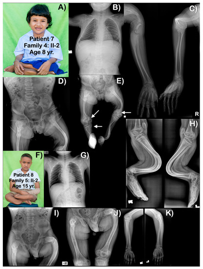 (A–E) Family 4. Patient 7 (Family 4: II-2). Age 8 years. Generalized osteopenia is evident. All long bones are slender, with humeri, femora, and tibiae severely shortened and curved. Proximal epiphyses and metaphyses of humeri are large. Multiple past fractures of long bones are evident. (E) Distal femora are bulbous with popcorn calcifications (arrows). Right proximal tibia has popcorn calcifications (arrow). (F–K) Family 5. Patient 8 (Family 5: II-2). Age 15 years. Generalized mild osteopenia. Humeri and femora are shortened. Fractured left proximal ulnar is seen. Unlike other patients, long bones are not slender. Femora and left humerus are bowed. Tibiae and fibulae are severely bowed anteriorly. Popcorn calcifications are not observed.