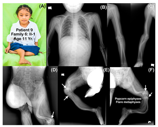 (A–F) Family 6. Patient 9 (Family 6: II-1). Age 11 years. Generalized osteopenia. All long bones are slender and curved. Femora are severely shortened. Fracture of right femur is noted. (D–F) Popcorn epiphyses and metaphyses at distal femora are visible (arrows).