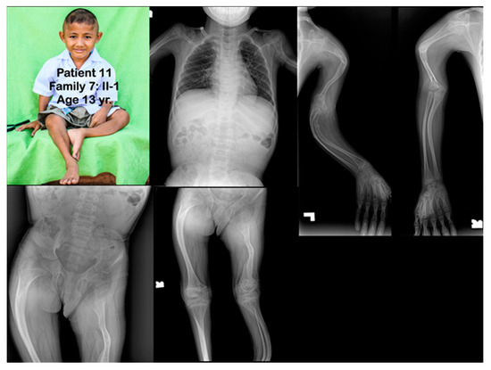 Family 7. Patient 11 (Family 7: II-1). Age 13 years. Generalized severe osteopenia. All long bones are severely slender and bowed. Humeri and femora are shortened. Fractures of clavicles are noted. Multiple fractures of long bones are healed. Metaphyseal flare of distal femora, proximal tibiae, proximal humeri, and distal humeri are noted. Popcorn calcifications are not observed.