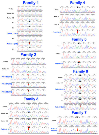 We investigated 11 patients from seven families (Figure 1), all living in Suan Pheurng city, Ratchaburi province, Thailand, near the border of Myanmar. The patients, their parents, and their ancestors belong to the Karen tribe originating in Myanmar. They migrated from Myanmar to their current location about 20 years ago. Very few parents knew whether they were related to each other.