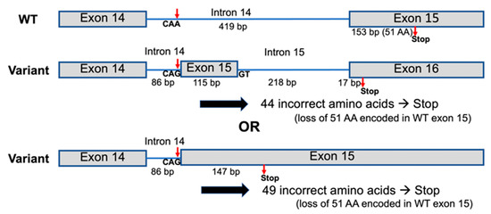 Two possible models for the effect of the P3H1 variant on the splicing of P3H1 isoform a to form new isoforms. The variant CAG sequence is predicted to act as a constitutive splice acceptor site with 89% confidence, compared to an 8.6% chance for the consensus CAA sequence [13]. A GT sequence 116 bp later is predicted to act as a constitutive splice donor with 75% confidence. The use of this splice donor site gives the upper variant model an extra intron and exon and replaces the 51 amino acid residues encoded in exon 15 of isoform a with 44 alternative amino acids, with a frameshift in the final exon leading to an early stop codon. If the splice donor site is not used (lower variant model), intron 14 is reduced to 86 bp, and 49 codons are added from the former intron before a stop codon. In either case, the new C-terminal amino acid sequence is not functional.