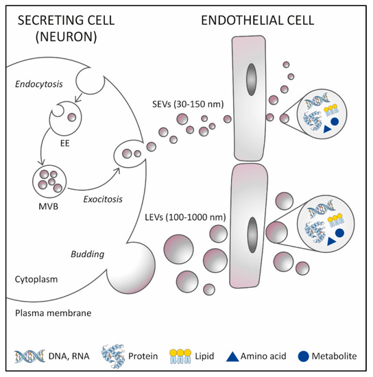 Figure 1. Formation of extracellular vesicles (EVs) and transport across the blood–brain barrier (BBB). Large EVs (LEVs) and small EVs (SEVs) are two subtypes of EVs, that can be distinguished by their size and biogenesis. LEVs are shed by budding of the plasma membrane, whereas SEVs are formed intracellularly and released by exocytosis of multivesicular bodies (MVBs). EVs can cross the BBB and thus enable various components, specific to secreting cells, including nucleic acids, proteins, amino acids, lipids, and metabolites in the EVs to be transported from the central nervous system (CNS) to peripheral biofluids. EE, early endosome.