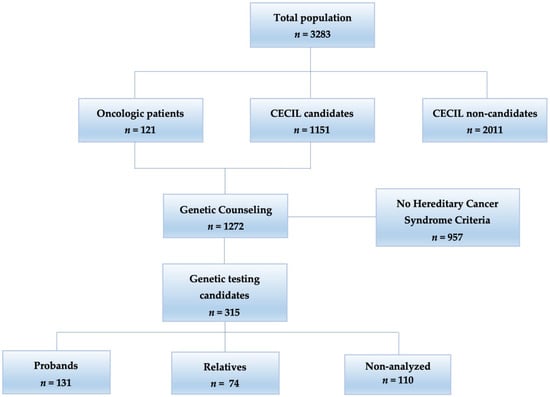 In a period of 6 years (from June 2016 to April 2022), the cancer prevention program at the CECIL recruited a total of 3283 patients: 2011 patients (61.25%) were classified as non-candidates, and 1272 (38.74%) as candidates for genetic counseling (121 oncologic patients referred from different oncologic centers, and 1151 open population self-referred patients), according to both filters (Figure 1).