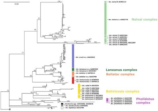Maximum likelihood (70% majority-rule bootstrap consensus) COI barcode tree of the subgenus Kerteszia. The UFBoot approximation is significant at the level of 95% support.